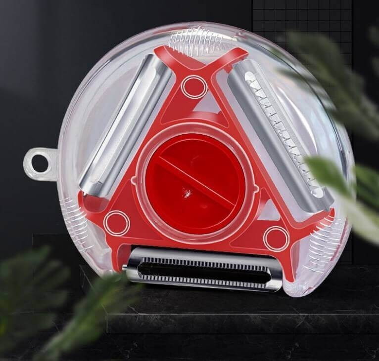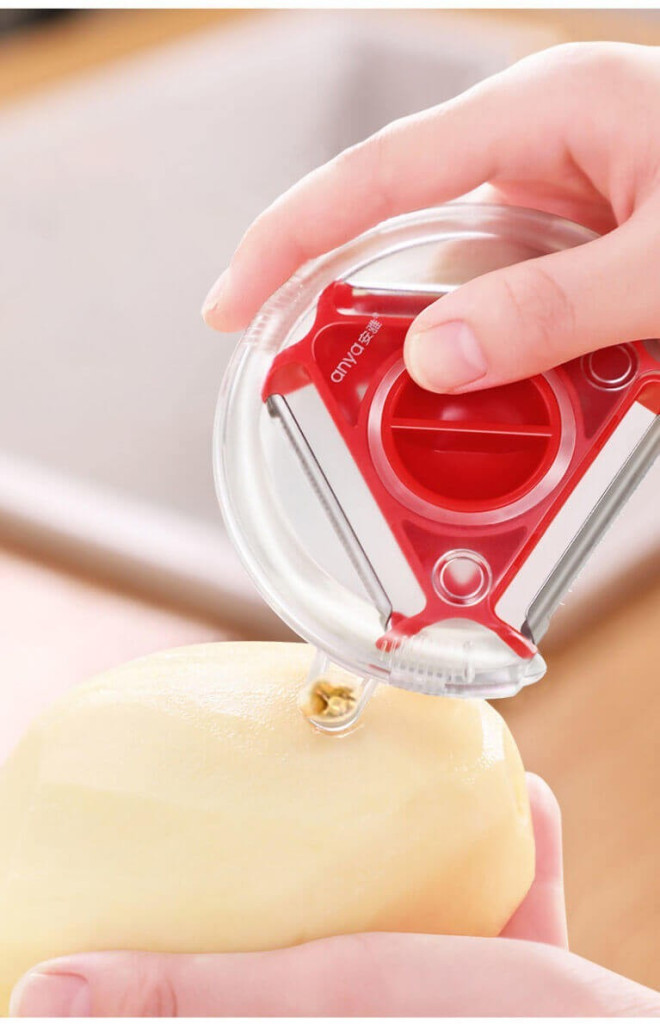 A 3 az 1 -ben konyhai hámozó minőségi, univerzális konyhai eszköz. Rozsdamentes acél pengéivel könnyen meghámozhatod a gyümölcsöket és zöldségeket. 3 pengéje van: általános (kemény zöldségekhez), fogazott (gyümölcsökhöz) és julienne (cukkinihez, répához). Zárrendszere biztonságosan rögzíti a pengét. Továbbá tartása is kényelmes az ergonomikus kialakításának köszönhetően (a hüvelykujjaddal jobb és bal kézzel is kényelmesen tudod tartani a neki kialakított helynek köszönhetően). A romlott részeket egy kiálló lyukasztóval ki is tudsz vájni.