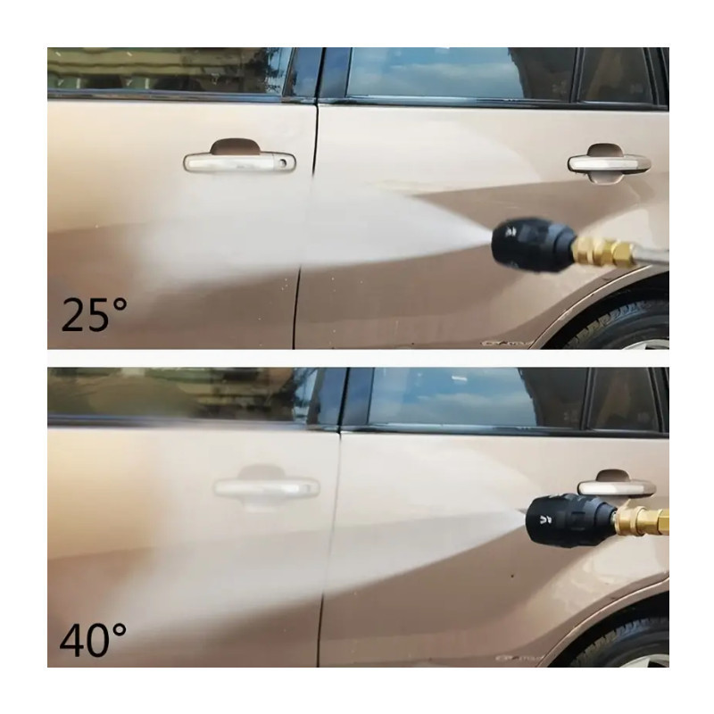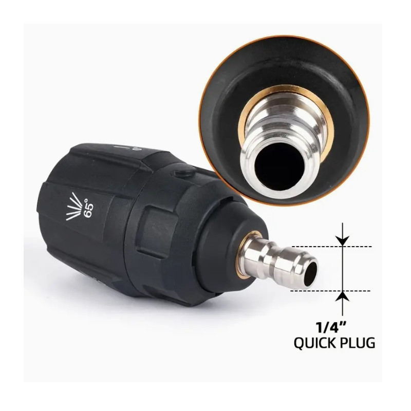 A nagynyomású mosópisztoly adapter végét képezi a fúvóka, amely könnyen csatlakoztatható az 1/4 dugóval. 1/4" belső menetes gyors csatlakozó sárgarézből készült, amely megakadályozza a rozsdát és a korróziót. A másik végét be kell helyezni a pisztolyba, és forgasd el az adaptert az óramutató járásával megegyező irányba, így könnyen csatlakoztatható és leválasztható. Könnyen és gyorsan használható a végeredmény pedig magáért beszél. Erőteljes hatásának köszönhetően ideális nagy, sík felületek, például autóbeállók és teraszok tisztítására is.