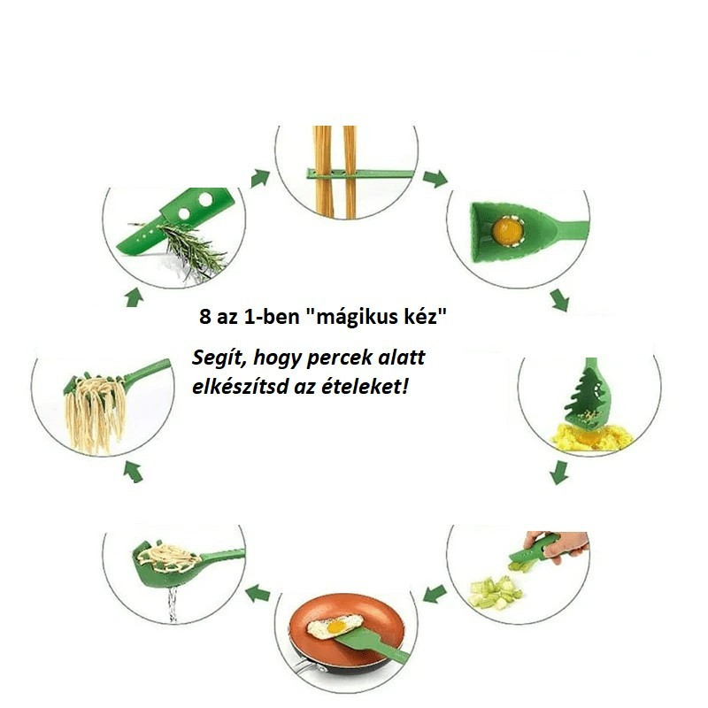 Az innovatívan kialakított 8 az 1-ben konyhai spatula használatával, több főzési feladatot is hatékonyan elvégezhetsz csupán egy eszközzel. Minden konyhai műveletben a rendelkezésedre áll, a zöldségvágástól, az étel elkészítésétől a főzésen át a tálalásig.