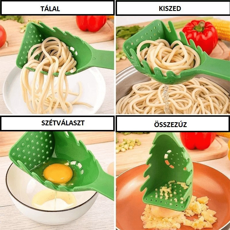 Használható: zöldségszeletelő, szűrő, kiszedő, tojáselválasztó, összenyomó vagy konyhai spatulaként is. Ráadásul kompakt kiszerelésének köszönhetően a konyhapulton rengeteg helyet takaríthatsz meg.