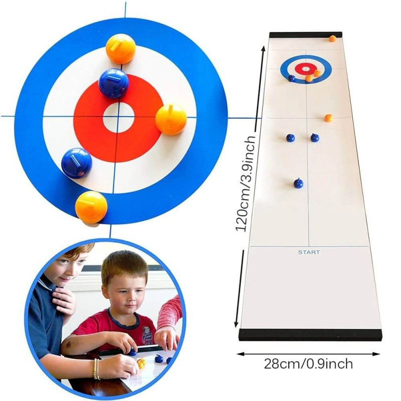 Az Asztali Curling társasjáték tulajdonságai: - Mérete: 145cm x 28.5cm - Feltekerhető kialakítás - Ajánlott kor: 6 éves kor felett - Átlagos játékidő: 30 perc - Játékosok száma: 2, 4, 8 fő Mit rejt a termék doboza? - 1 db pálya - 8 db curling golyót
