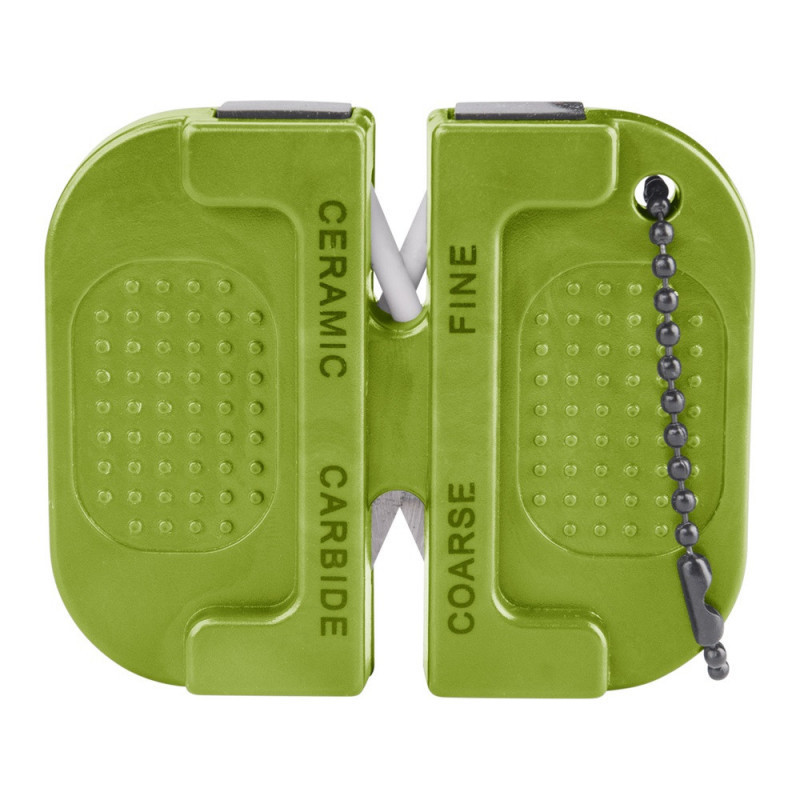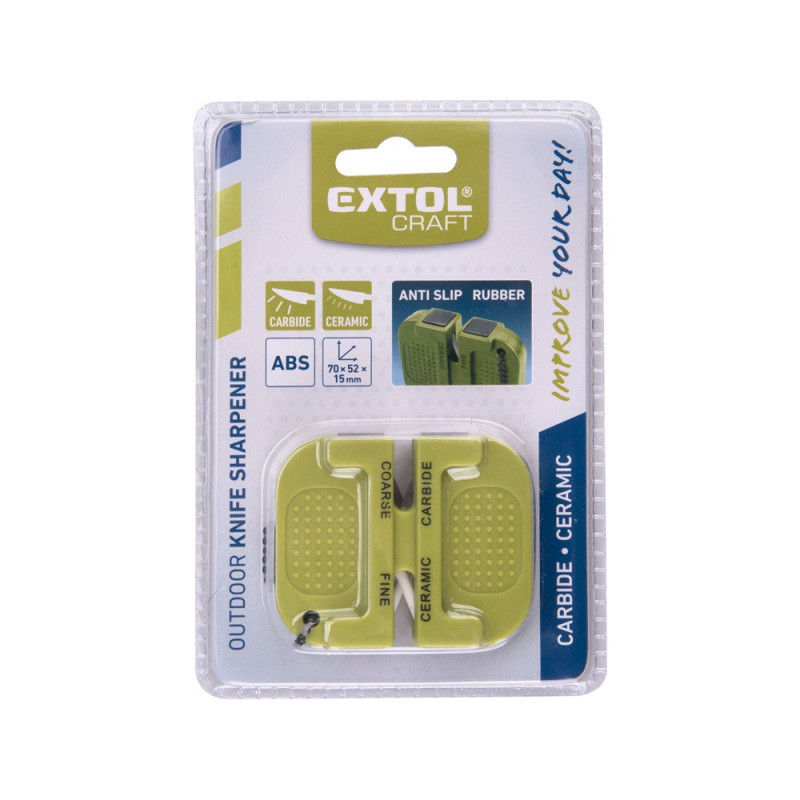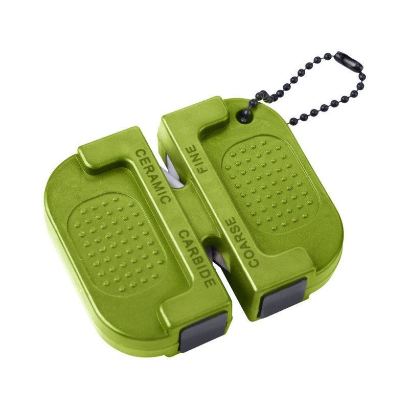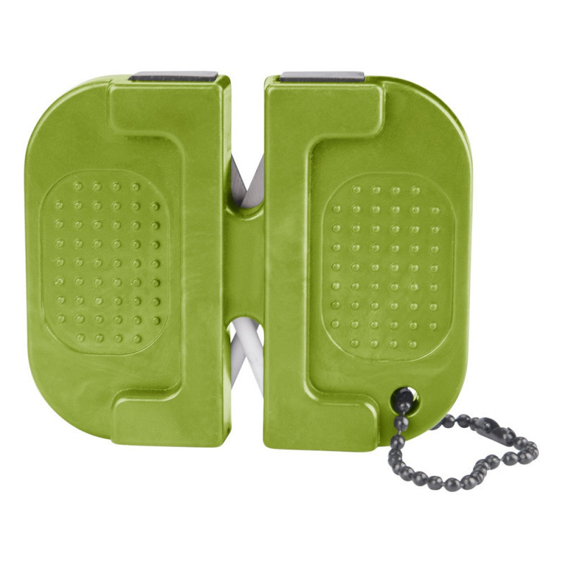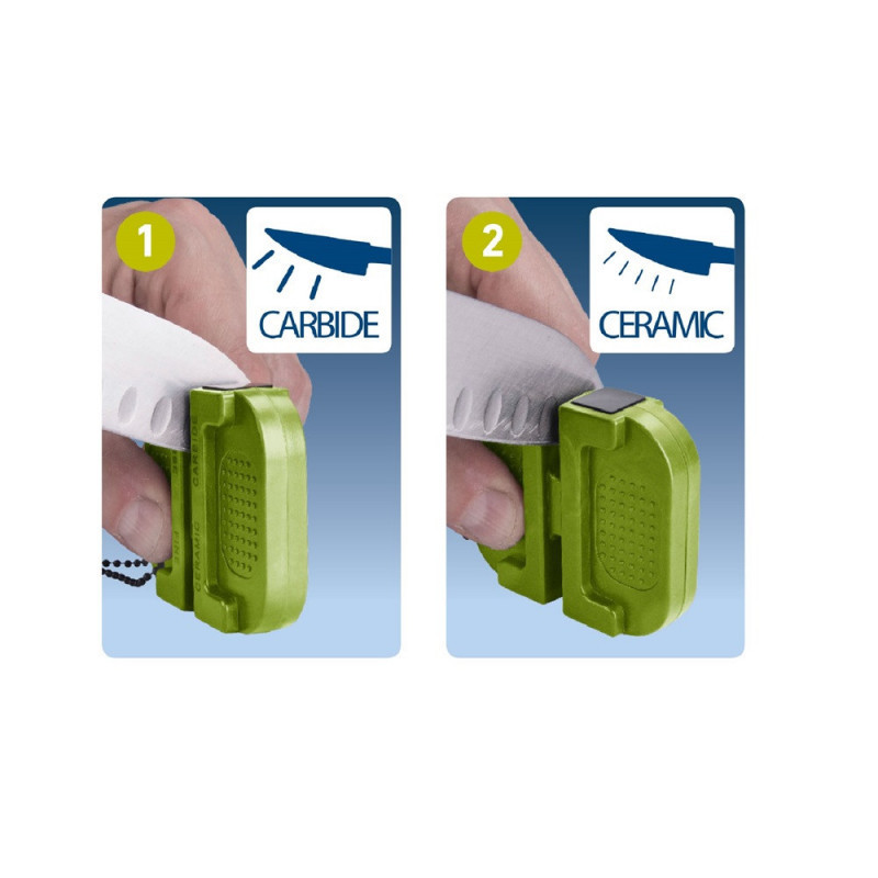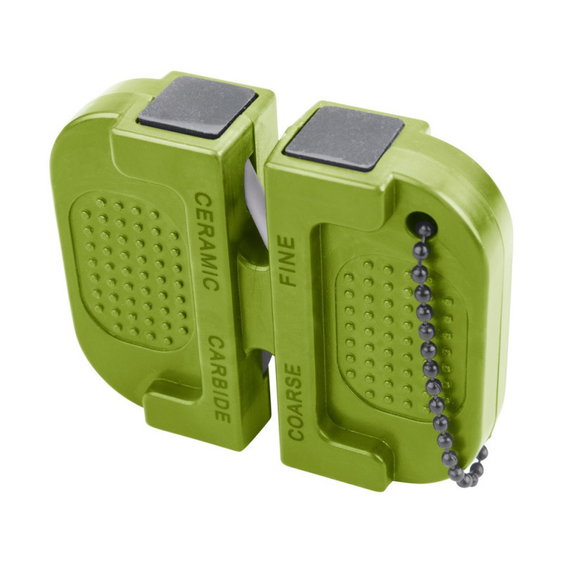 méretek: 70×52×15mm, kültéri használatra is, ABS ház csúszásgátló gumitalppal, keményfém (carbide) betét durva élezéshez és kerámia betét finom élezéshez, mindenféle sík (nemfogazott) acél pengéhez, hordozó lánccal.