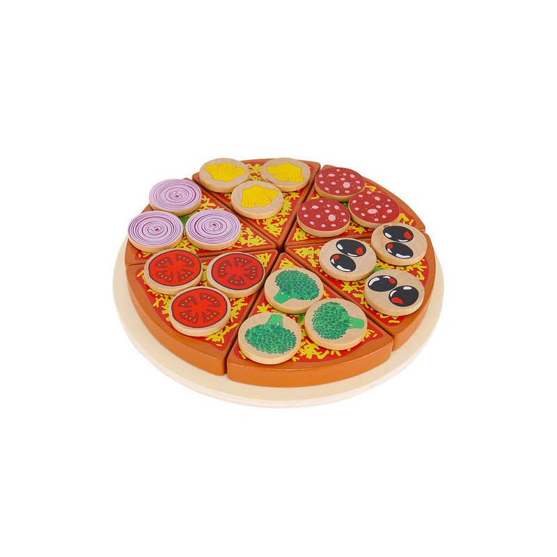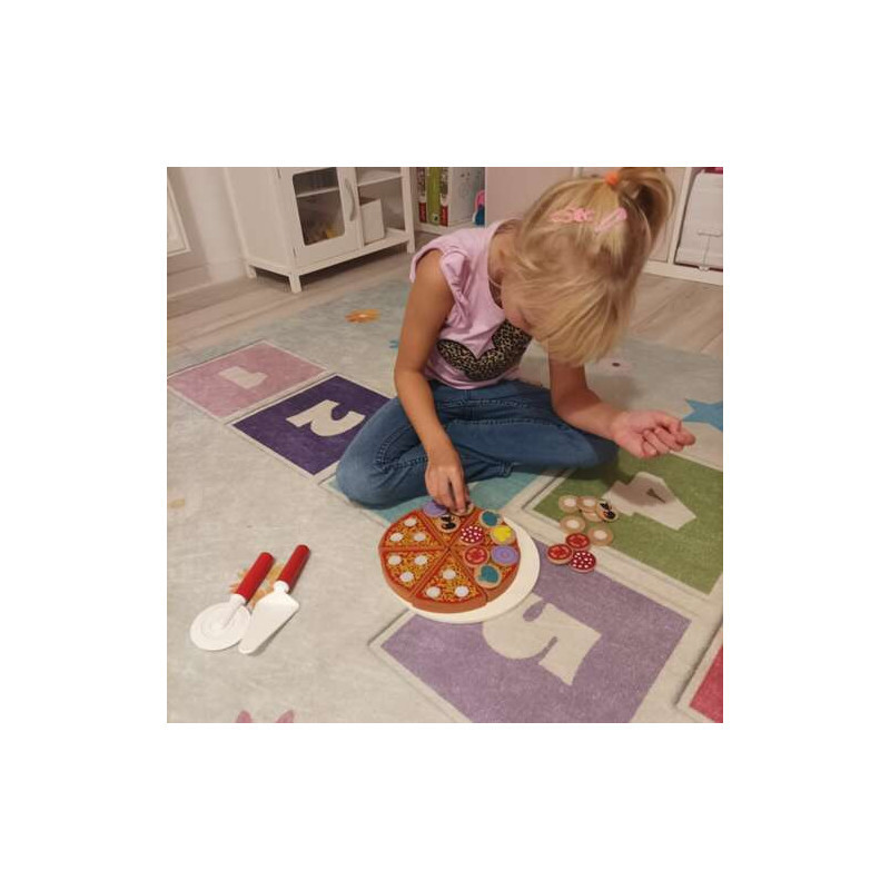 Összesen 27 elemet találsz a csomagban, amelyek mindegyike kiváló minőségű fából készült, és speciális, egészségre nem káros festékkel van bevonva. A tépőzáraknak köszönhetően a pizzát újra és újra összerakhatod, miután játszottál vele.