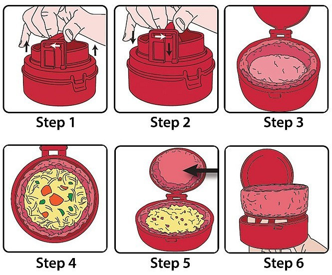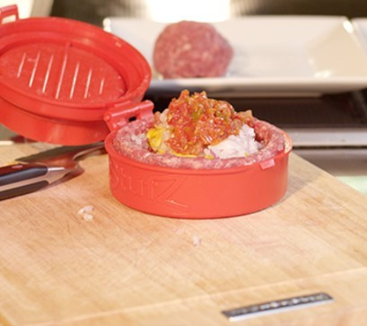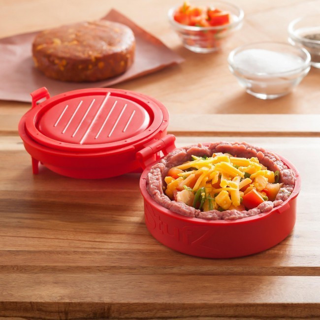 Első lépésként töltsd meg az eszköz alját hússal, majd nyomd össze a formázót. Ezt követően az így létrejött kis vájatba helyezz ízlésednek megfelelően sajtot, sonkát vagy zöldségeket. Ízesítsd saját ízlésed szerint. Ha ezzel is megvagy, kend ki az eszköz tetejét darálthússal, majd nyomd össze és már készen is vagy!
