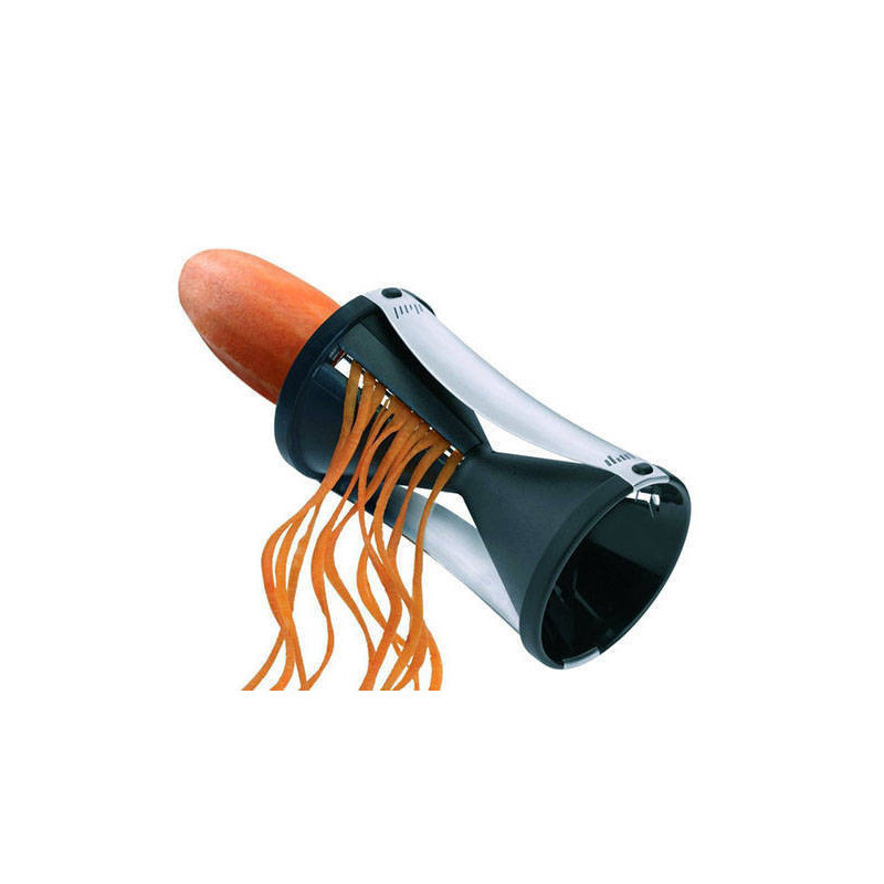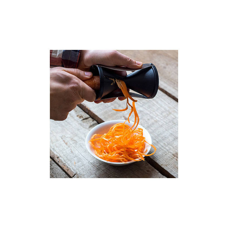 A spirális díszítő élesítő egy fantasztikus eszköz a konyhában, amely segít feldíszíteni az ételeket. Hozzáad egy kis karaktert az ételeidhez, és gyönyörűvé teszi azokat a tányéron. A díszítő élesítőt használhatod végtelen mennyiségű julienne szelet készítésére sárgarépából, uborkából, retekéből, cukkiniből és más kemény zöldségekből. A kétoldalas spirális élesítő ideális egészséges és alacsony kalóriatartalmú cukkini vagy sárgarépa spagetti készítésére. A spirálok tökéletesek serpenyős zöldségételekhez vagy tésztaételekhez.