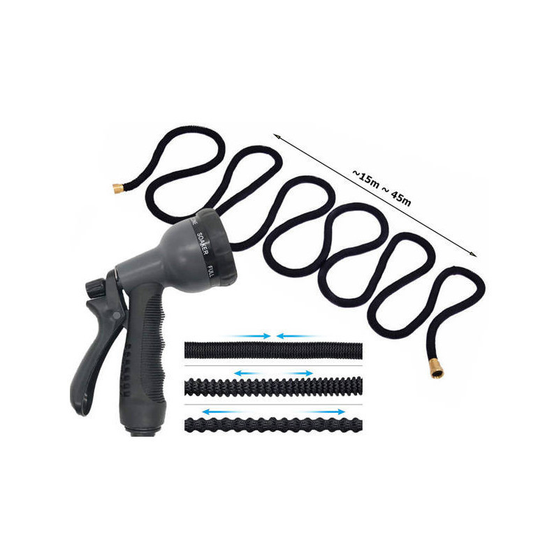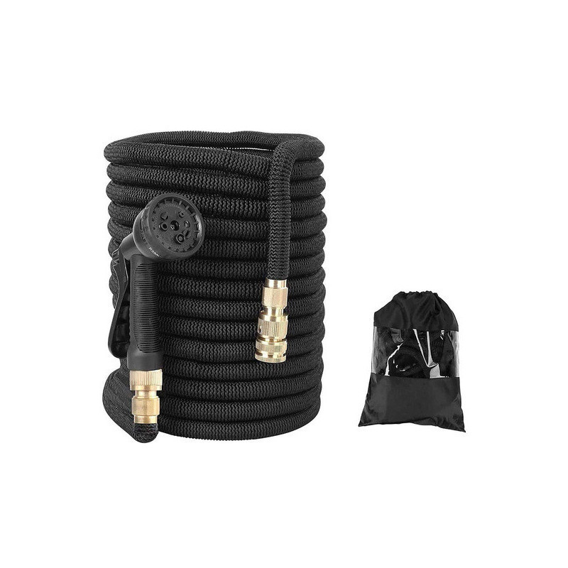 A kerticső a leggyakrabban használt kerti felszerelés, ami nemcsak a kertben, hanem más tevékenységek során is hasznos, mint például az autómosás, szőnyegmosás, padló felmosása stb. Nagyon könnyű a hagyományos kerti csövekhez képest. Amikor vízzel megtöltik, a cső hossza megháromszorozódik és ezt megtartja használat közben. Amikor vége a munkának, nincs szükség kézzel kiönteni a vizet, automatikusan kifolyik. Működés közben, ellentétben az régi stílusú eszközökkel, nem gubancolódik vagy tekeredik össze. A cső felszerelésekkel van ellátva, amelyek bírják a magas víznyomást, így hosszú ideig tart. A készlet tartalmaz egy akasztót, amire fel lehet akasztani a csövet, amikor nem használod. A készlet tartalmaz egy szereléket is, amit a csap menetére lehet felhelyezni. A cső minőségi poliészter szövettel, két réteg latex-szel és ABS műanyaggal készült. Ezenkívül egy multifunkciós locsolót is tartalmaz 8 móddal és zárolási funkcióval. Egyszerűen forgasd el a fém akasztót a fegyverben, hogy rögzítsd a ravaszt. A víz akkor fog folyni, anélkül, hogy folyamatosan meg kellene nyomnod a ravaszt. A fegyvernek kényelmes, csúszásmentes fogantyúja is van.
