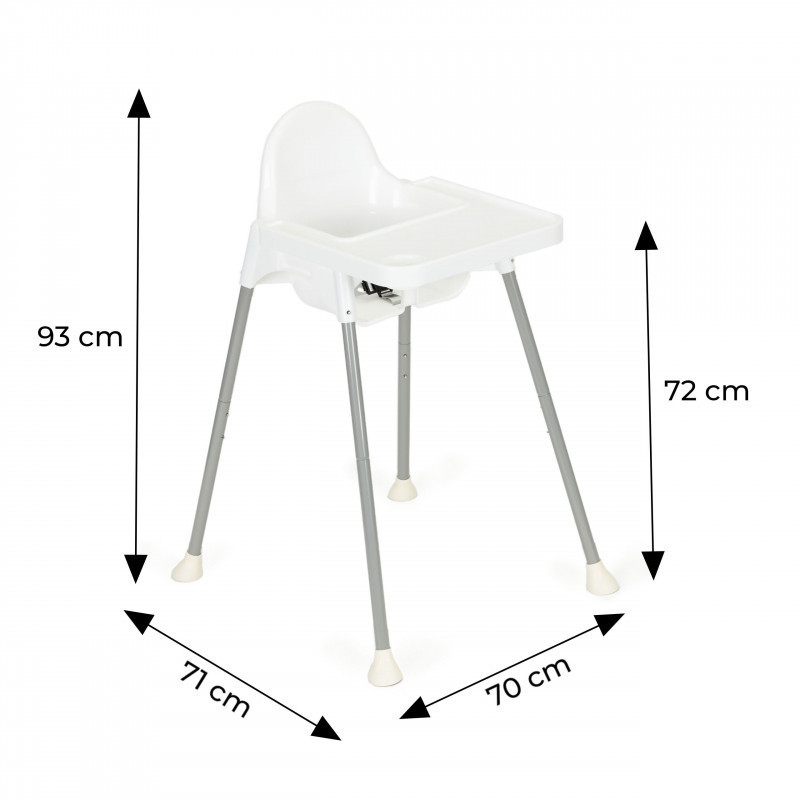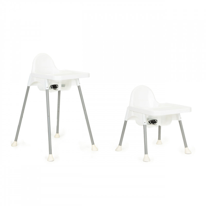 A szék magassága állítható. Könnyen szétszerelheti a lábakat és a lábtartót, így a magas ülőhelyet alacsonyabb székké alakíthatja át. Ha kisgyermek önállóvá válik, és már nem kell folyamatosan figyelnie őt az étkezések során, egy alacsonyabb szék tökéletes lesz számára.