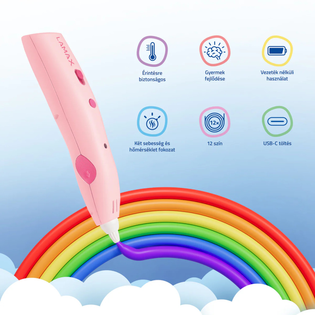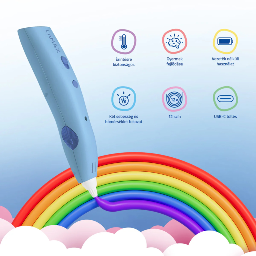 3D toll LAMAX ArtKid1 3D, vezeték nélküli, ergonomikus, biztonságos LAMAX TouchSafe technológia, nem mérgező hipoallergén utántöltők, 2 sebesség, 2 hőmérsékleti fokozat, 12 utántöltő szín, USB-C, izzószál átmérője (töltés) 1,75 mm