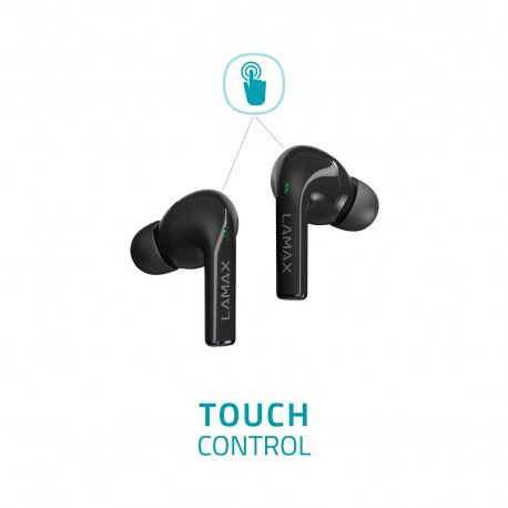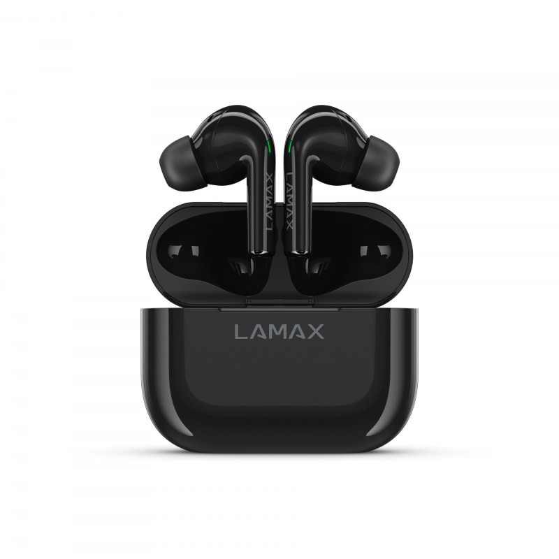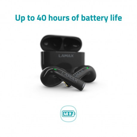 Vezeték nélküli TWS fejhallgató, fülbe helyezhető, 8 óra üzemidő/1 töltés, 40 óra teljes üzemidő, akár 10 méter Bluetooth 5.1, hatótávolság, érintésvezérlés, USB-C, LAMAX BeatBass® technológia, automatikus párosítás, játékmód, kis dokkoló tok, töltésjelző, AAC és SBC kodekek, hangasszisztens támogatás, pót fülpárnák.