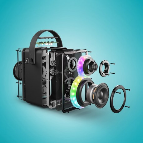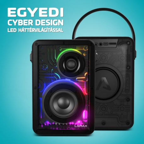 Vezeték nélküli, hordozható partihangszóró, 4 állítható Cyber LED-effekt, kétutas hangszóró, 50 W teljesítményig, BeatBass technológia, Bluetooth 5.3, automatikus párosítás, akár 20 órás akkumulátor, USB-C, IPX6, formátumok és csatlakozások variálhatósága.