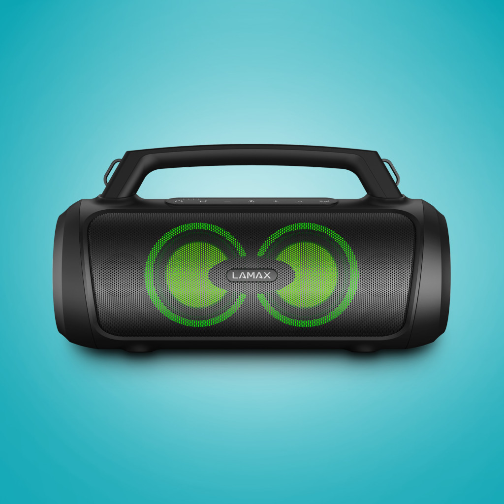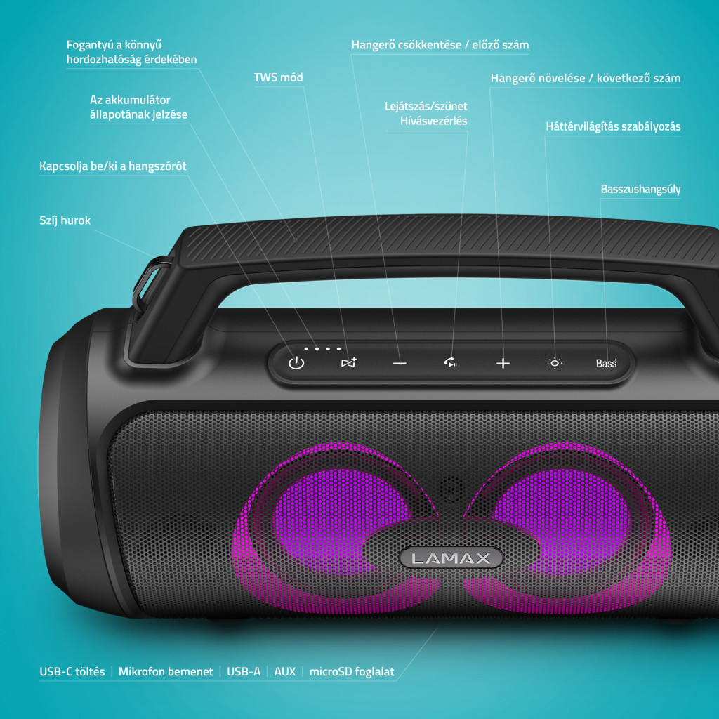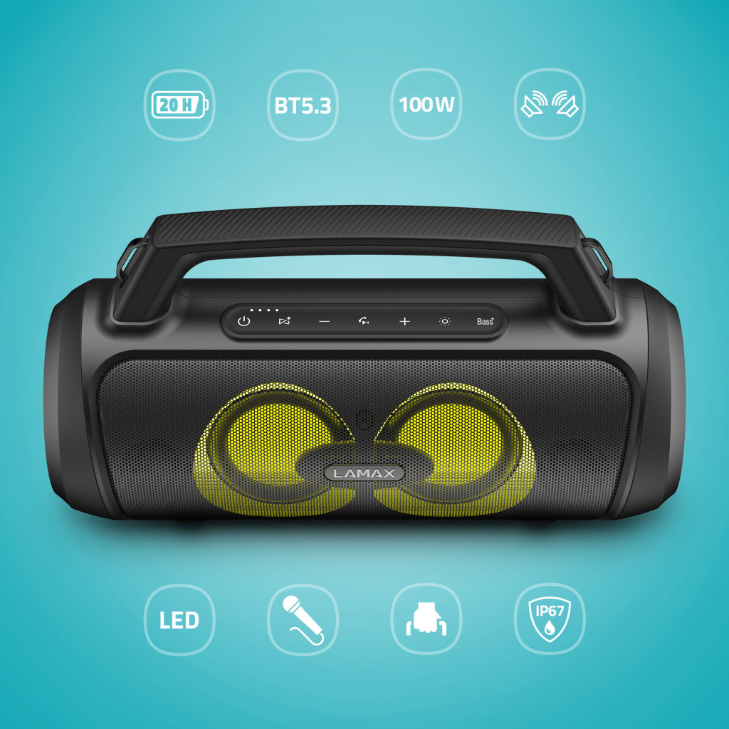 Hordozható Bluetooth party hangszóró fogantyúval, BT 5.3, teljesítmény 100 W, 3 LED háttérvilágítási mód, 20 órás akkumulátor-üzemidő, vezérlés iOS vagy Android eszközökön, vezetékes mikrofon mellékelve, LAMAX BeatBass®, vízálló IP67, 6,3 mm-es jack, SD kártya, USB-A bemenet, power bank funkció, TWS funkció egy második hangszóró csatlakoztatásához.