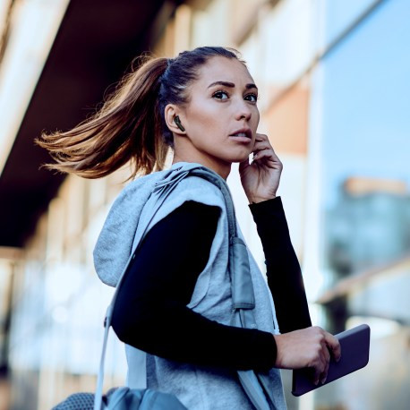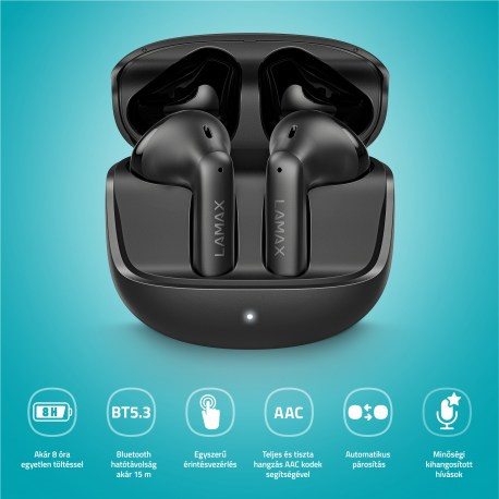 Vezeték nélküli Bluetooth in-ear fejhallgató LAMAX Tones1, tiszta és kiegyensúlyozott hangzás, akár 8 órás akkumulátor-üzemidő, további 32 óra a tokban, Bluetooth 5.3, hatótávolság akár 15 m, minőségi mikrofon, érintésvezérlés, hangasszisztensek támogatása, USB-C.