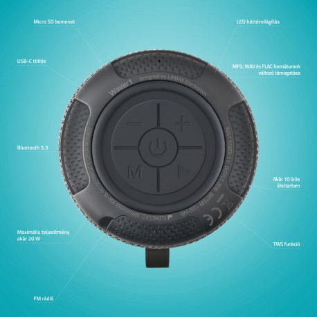Hordozható vezeték nélküli hangszóró Bluetooth 5.3-mal, tiszta és kiegyensúlyozott hangzással, kompakt kialakítással, TWS funkcióval, microSD kártyahely, különböző formátumok támogatása, 20 W teljesítmény, 10 órás akkumulátor, LED-effekt, USB-C és IP65 vízállóság.
