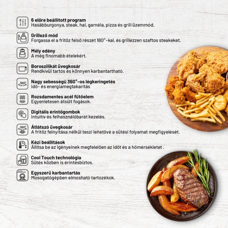 Forrólevegős sütő - teljesítmény 1 500 W, térfogat 5,5 l, egyedülálló üveg sütőkosár, a legegészségesebb anyag nem hagy maga után teflon utóízt vagy aromát, 3 az 1-ben használható grillező vagy mélysütő serpenyő, a készülő étel 360°-os láthatósága a program megszakítása nélkül, mosogatógépben elmosható kosár, 6 előre beállított program, automatikus kikapcsolás, hőmérséklet 80°C - 220°C, időbeállítás 1-60 perc, kábel hossza 100 cm
