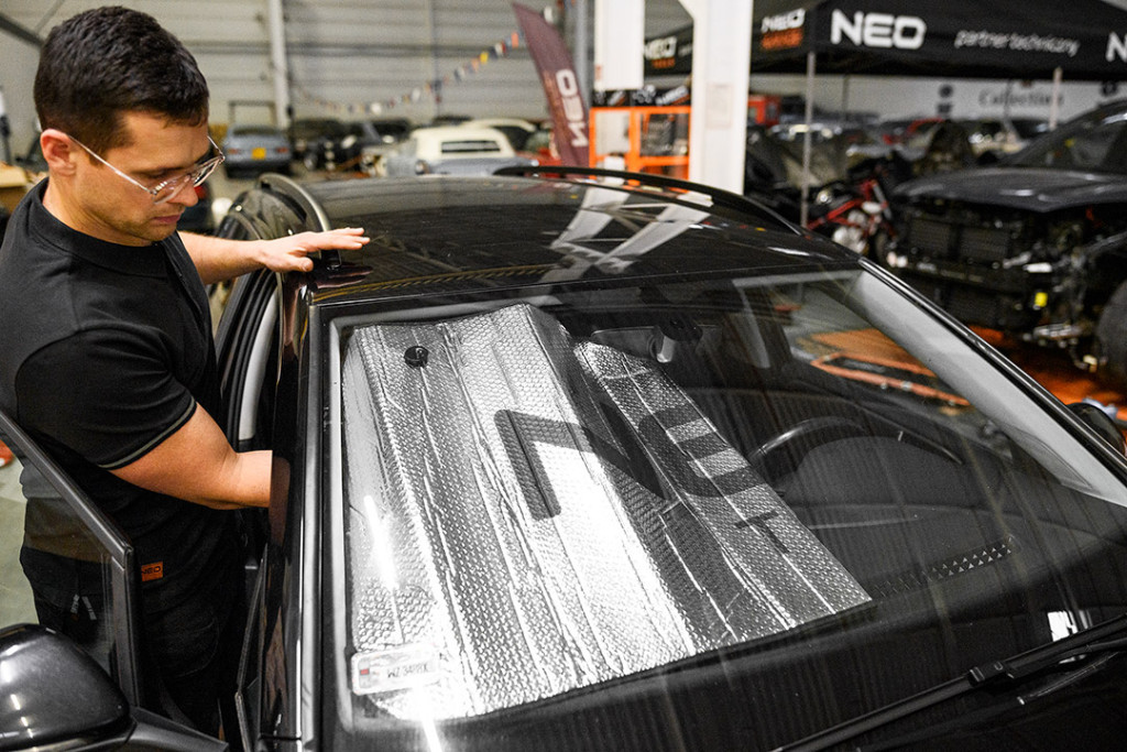 NEO szélvédőtakaró. Max. 1380 x 700 mm-es szélvédőkhöz tervezve. Dupla szigetelőréteggel rendelkezik, és könnyű alumíniumból készült, bármilyen típusú gépkocsihoz ajánljuk.