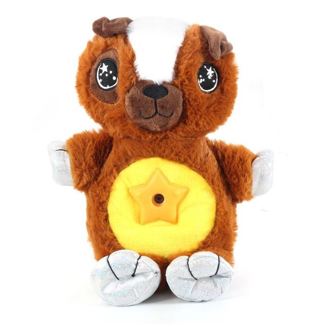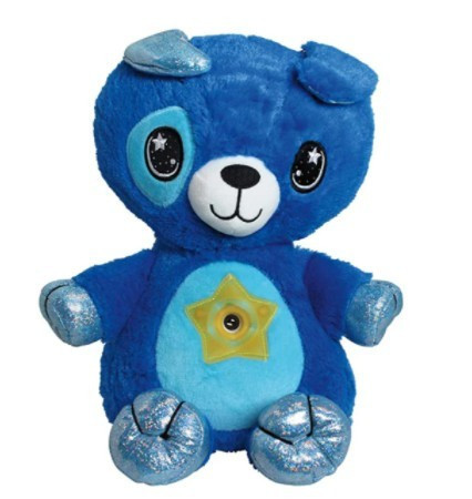 A plüss pocakjának megnyomása után bekapcsol a projektor, ami varázslatosan világítja meg a mennyezetet.