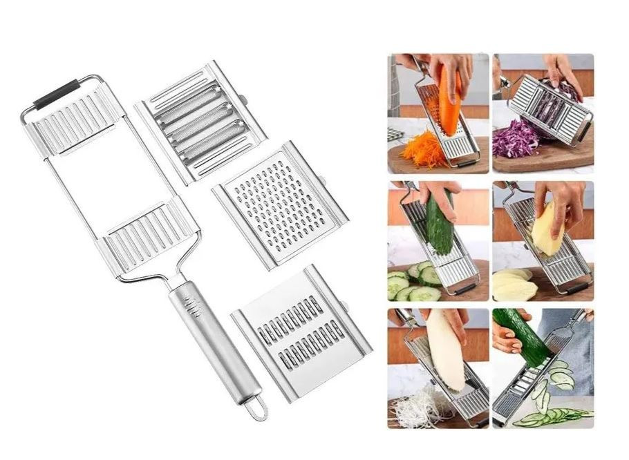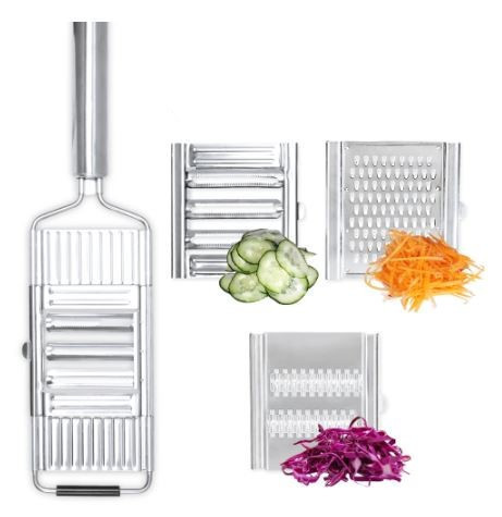 Hasznos tudnivalók: Rozsdamentes acél pengéi időtállóak. Könnyen kezelhető és kevés helyet foglal. Rendkívül könnyen tisztítható. A készlet 3 különböző szeletelő/ reszelő pengét tartalmaz. Az ergonomikus fogantyú szilárd, stabil fogást biztosít. A termék tulajdonságai: Anyag: rozsdamentes acél Mérete: 35,5x8,5 cm Mit rejt a termék doboza? 1db Reszelő, szeletelő 3 cserélhető betéttel