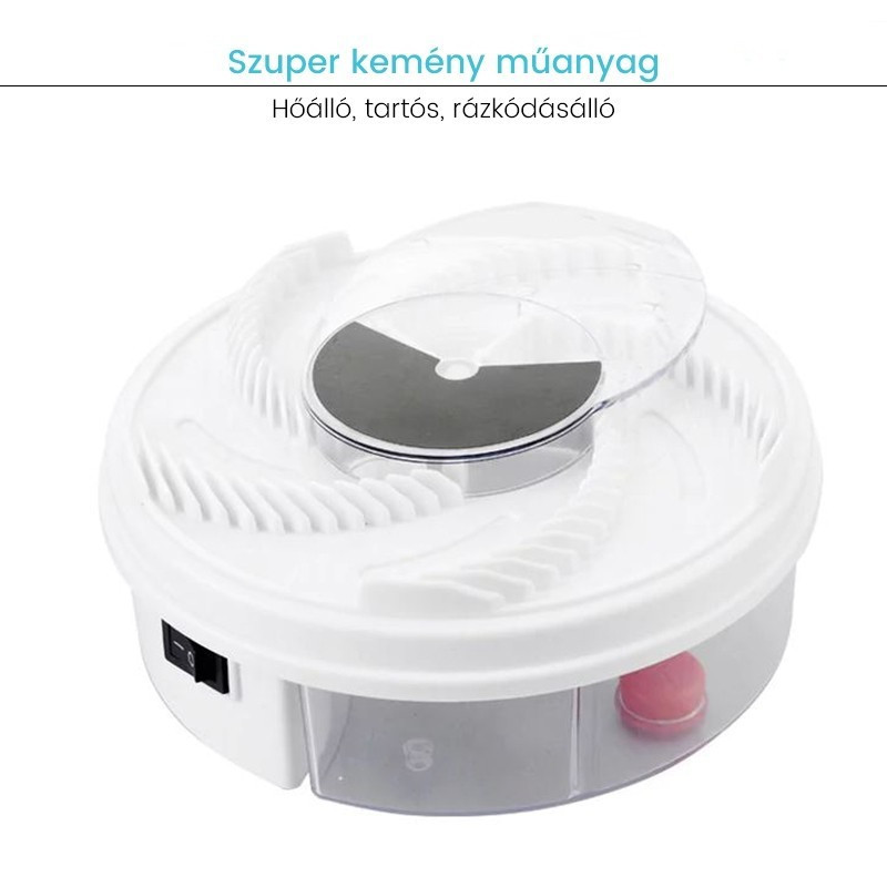 Rakd a csali étket a doboz tetején található csíkszerű lyukakba, majd kapcsold be az oldalán található gombbal, hogy forogni kezdjen. A csali étel odavonzza a rovarokat és folyamatosan tolja be őket a doboz tartályába. Ha megtelt, ürítsd ki és helyezd el újra, ahol szükséges.
