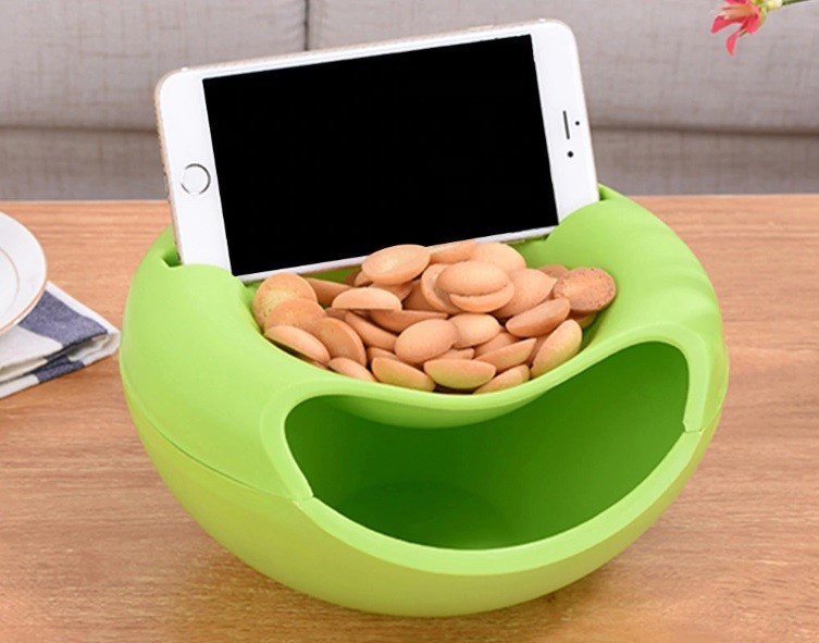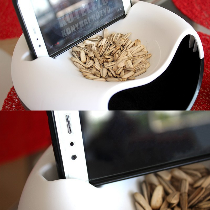 Mi több, a kütyü úgy lett kialakítva, hogy nemcsak kedvenc csemegéd tárolására alkalmas, de telefonod számára is stabil helyet biztosít. Tehát, ha éppen filmet vagy videót néznél a mobilodon és közben bekapnál pár falatat, a nasitál tökéletesen kiszolgálja igényeidet.