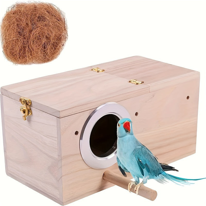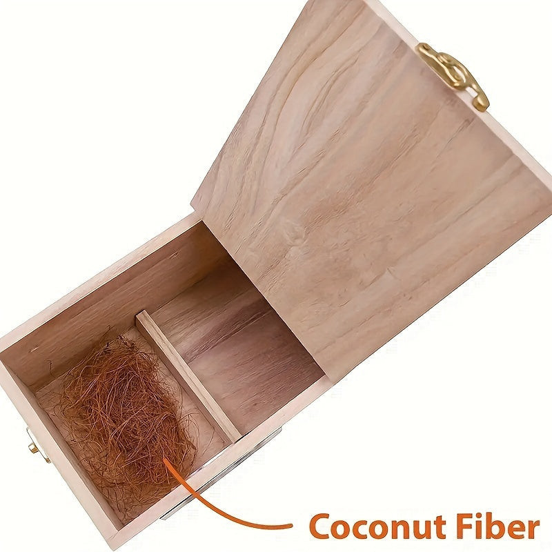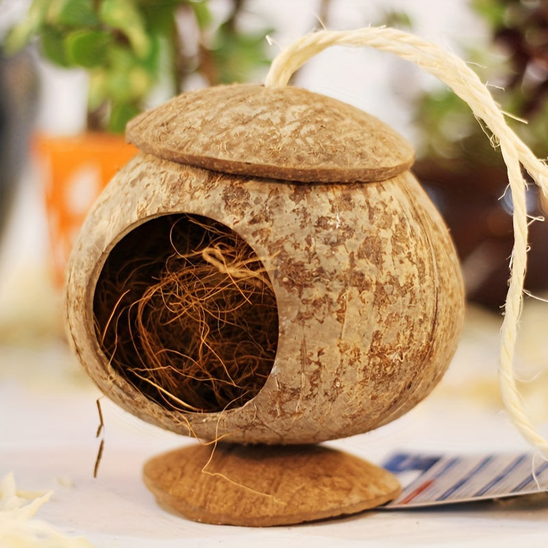 (Tervezési részletek) A fészek kialakítása a madarak igényeire lett szabva, így biztosítva számukra a megfelelő kényelmet és védelmet. A kókuszrostból készült szálak természetes szellőzést biztosítanak, ami segít a fészek belső hőmérsékletének szabályozásában. Könnyen rögzíthető faágakra vagy más stabil felületekre, így a madarak biztonságban érezhetik magukat, miközben a fészkükben pihennek vagy kiköltik a tojásaikat.