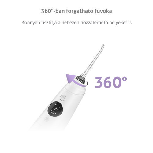 Elektromos orális zuhany, 5 üzemmód, barkács funkció, időzítő, memória funkció, 6 fúvóka (4 féle), 360°-ban forgatható fej, akkumulátor élettartama 14 nap, 300 ml-es tartály, USB kábel, kompakt kivitel, szín: fehér.