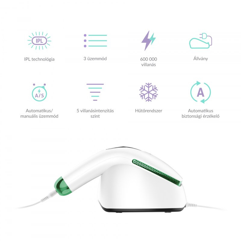 IPL Epilátor, az arc, a test és a bikinivonal fájdalommentes, tartós hatású szőrtelenítése, 600 000 villanás, SensCool® technológia, 3 feltét típus, LCD kijelző, 3 üzemmód, 5 fényintenzitás, könnyű használat, megtáplálás: elektromos hálózat, szín: fehér, zöld.