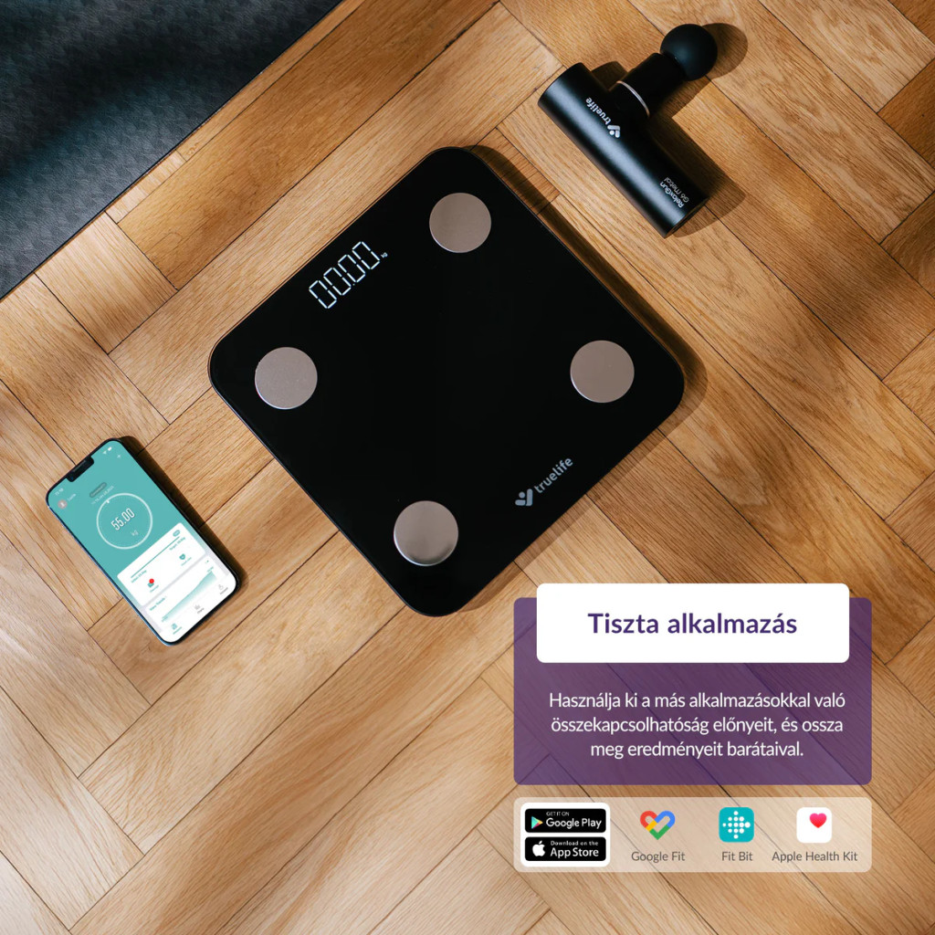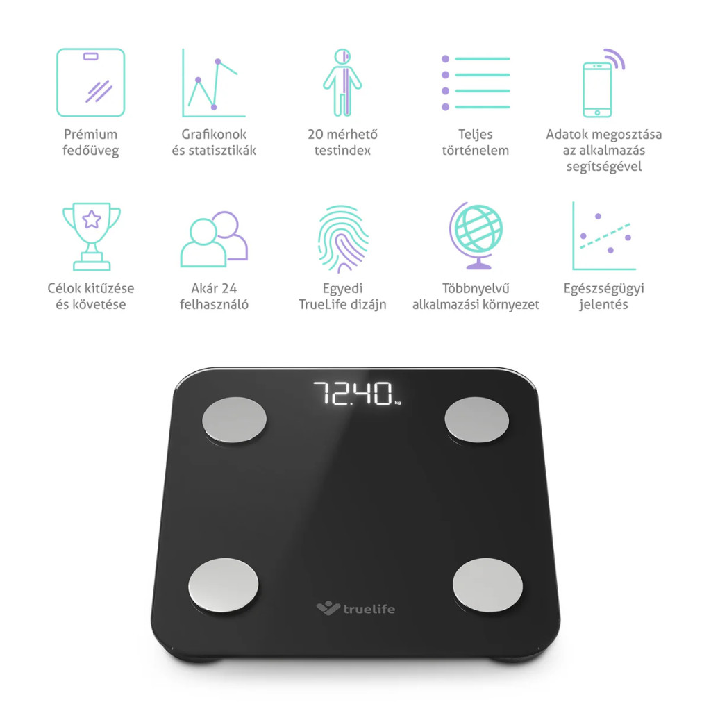 Személyes diagnosztikai Bluetooth mérleg, mérés bioelektromos impedanciaanalízissel, 20 mérhető testindex, LCD kijelző, akár 24 felhasználó, a mérleg párosítása mobilalkalmazással Bluetooth-on keresztül, kompatibilitás iOS és Android rendszerrel, szinkronizálás Apple HealthKittel, Google Fittel, Fitbittel alkalmazások, terhelhetőség 180 kg-ig, maximális eltérés 0,1 kg, lemez anyaga edzett üveg, fehér színű, AAA elemekkel működik