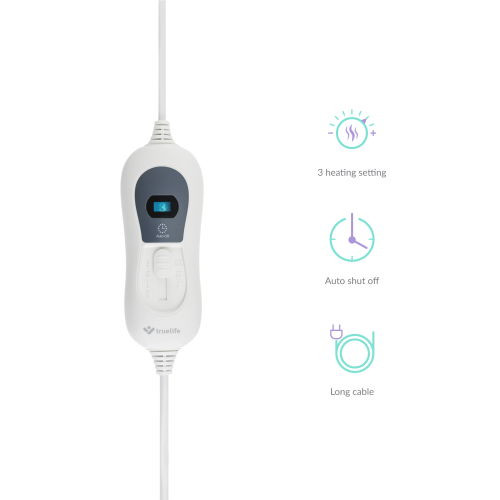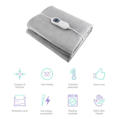 Fűthető takaró, 150 x 80 cm, védőhuzat a csomagolásban, 3 hőfokozat, automatikus kikapcsolás funkció, 3,3 m hosszú tápkábel, gyors és egyenletes melegítés, túlmelegedés elleni védelem, alacsony áramfogyasztás, mosógépben is mosható, egyszerű kezelés, utazásra alkalmas, segít enyhíteni a hát- és ízületi fájdalmakat.