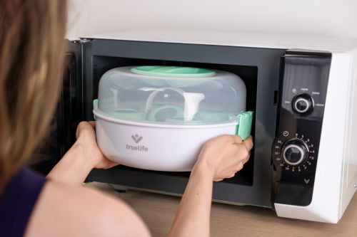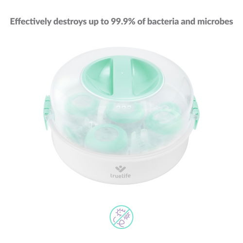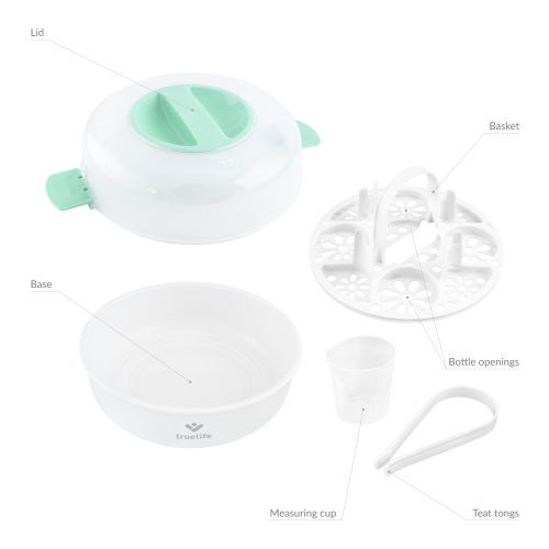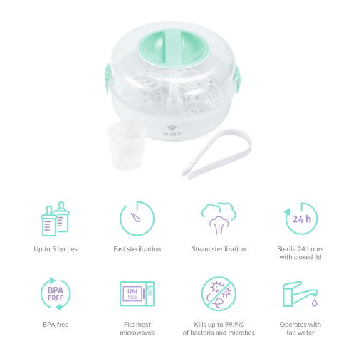 Mikrohullámú sütőben használható sterilizátor, kapacitása 5 palack, elpusztítja a baktériumok és mikrobák 99,9%-át, gőzsterilizálási módszer, időtartama 2 perc, a tárgyak 24 órán át sterilek maradnak, vegyszermentes használat, tartozékok: mérőpohár, fogó. Szín: fehér, zöld.