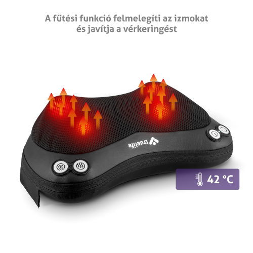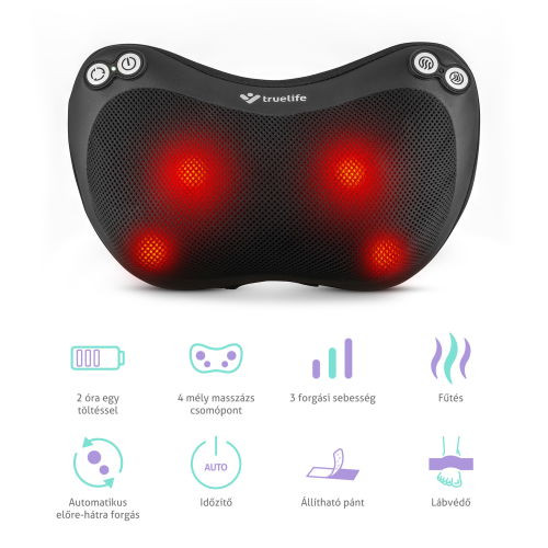 Széles körben használható masszázspárna újratölthető akkumulátorral és fűtéssel, 2 órás akkumulátor-élettartam, 3 forgási sebesség fokozat, időzítő, 2 forgófej 4 masszázscsomóval, USB-C töltés, állítható pánt rögzítéshez, lábvédő, könnyű karbantartás.