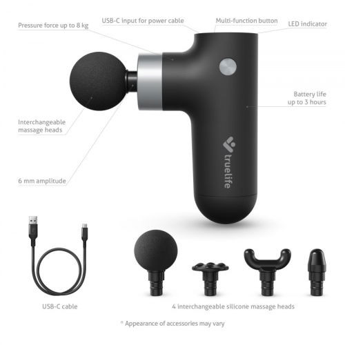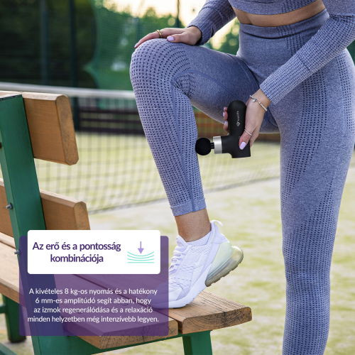Masszázspisztoly az izmok regenerálódásához, a feszültség oldásához, relaxációhoz és egyéb előnyökhöz. 4 cserélhető fej, 4 intenzitási fokozat, nyomáserő 8 kg, amplitúdó 6 mm, teljesítmény 2850 ford./percig. Biztonsági leállítás funkció, újratölthető lítium akkumulátor, akár 3 órás üzemidővel, csendes működés.