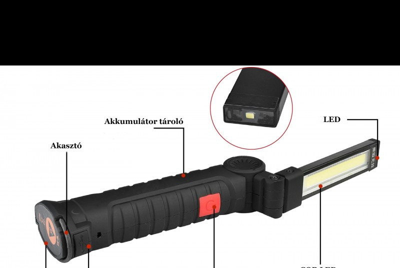 A fogantyúban elhelyezett mágnes segítségével bármilyen mágnesezhető fém felületre feltapaszthatjuk, így a leg elérhetetlenebb felületeket is meg lehet világítani vele. A világító fejet 360 fokban el lehet forgatni, így biztosan a kívánt pozícióba állítható. Töltése USB csatlakozón keresztül a csomagban mellékelt kábel segítségével lehetséges.